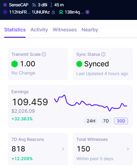 Finally, nearby miners will issue similar beacons, which your miner will witness and confirm the PoC or Proof of Coverage. The helium network is designed for low-power LoRa sensors, and as such, you will also see from time to time that you are transferring data from/to these sensors. However, the payments are not representative yet, unless you live in an area with thousands of active sensors, then it’s highly profitable.